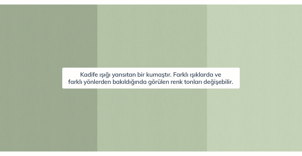 Kumaş Kadife dokulu, 100% polyester kumaş kullanılmıştır. Ekrandaki renkler değişiklik gösterebilir, kararını sağlıklı verebilmen için numune istemeni öneririz.
